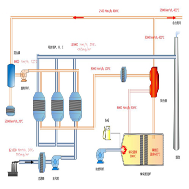 混合氣體通過溫度略低的蓄熱陶瓷流動。大量的熱能從煙氣轉移到蓄熱體,用于加熱下一個循環的有機廢氣。高溫煙氣本身的溫度大大降低,然后通過熱回收系統和其他介質進行熱交換,煙氣溫度進一步降低,排放到室外空氣中。